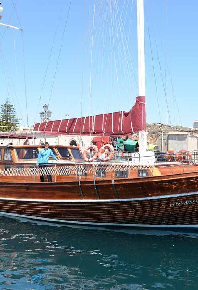 L’imbarcazione, dalle linee sinuose ed eleganti, il cui stile riverbera il gusto antico di forme classiche, salpando dal cuore dell’antica Milazzo, scivola attraverso le “sette sorelle”, Vulcano, Lipari, Salina, Panarea, Stromboli, Filicudi e Alicudi, condotta mirabilmente da un equipaggio competente e cordiale, per delle crociere indimenticabili, capaci di rappresentare un’alternativa originale alle consuete escursioni attraverso le isole, così da offrire la possibilità di attingerne la bellezza da inedite prospettive.
