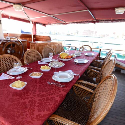 Il caicco all’interno, oltre ad offrire climatizzazione in tutta la superficie coperta, è dotato di frigo, freezer, lavastoviglie , generatore di corrente autonomo. Gli spazi disponibili sono molto confortevoli, completano la dotazione un meraviglioso solarium, comode cabine con ampio bagno, doccia, plancetta di poppa con ampio ed elegante salotto.
