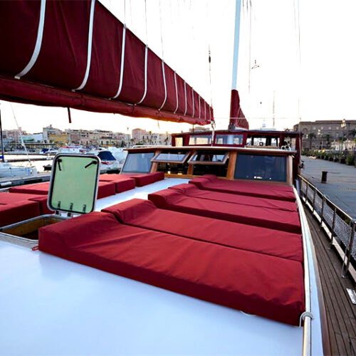 La barca è armata con due alberi in acciaio e due boma, per un totale di circa 200 mq di velatura tra randa, genoa e fiocco. La sua struttura gli conferisce un’ottima tenuta del mare e garantisce il massimo comfort durante la navigazione.